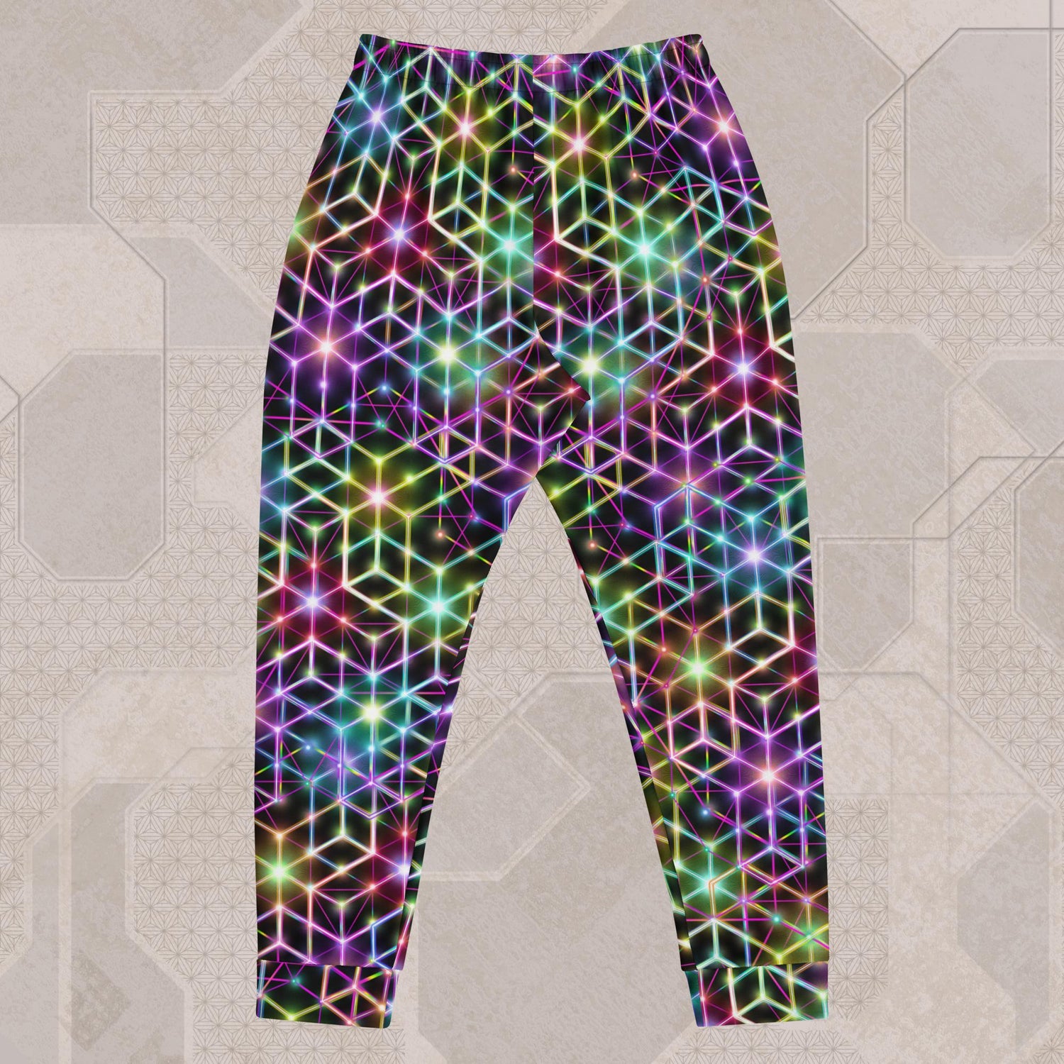 The slim fit and cuffed ankles create a clean, modern silhouette, while deep front pockets and a drawstring waist provide practical, secure comfort. Printed with UV-reactive, fade-resistant color on recycled materials, these joggers are made to move—whether you're lounging, dancing, or out on the go.