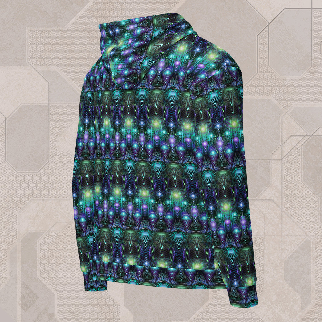 This psychedelic streetwear zip hoodie is designed for comfort, durability, and standout style. Made from GRS-certified recycled polyester, it features a soft cotton-feel exterior and plush fleece interior for warmth without the bulk.
