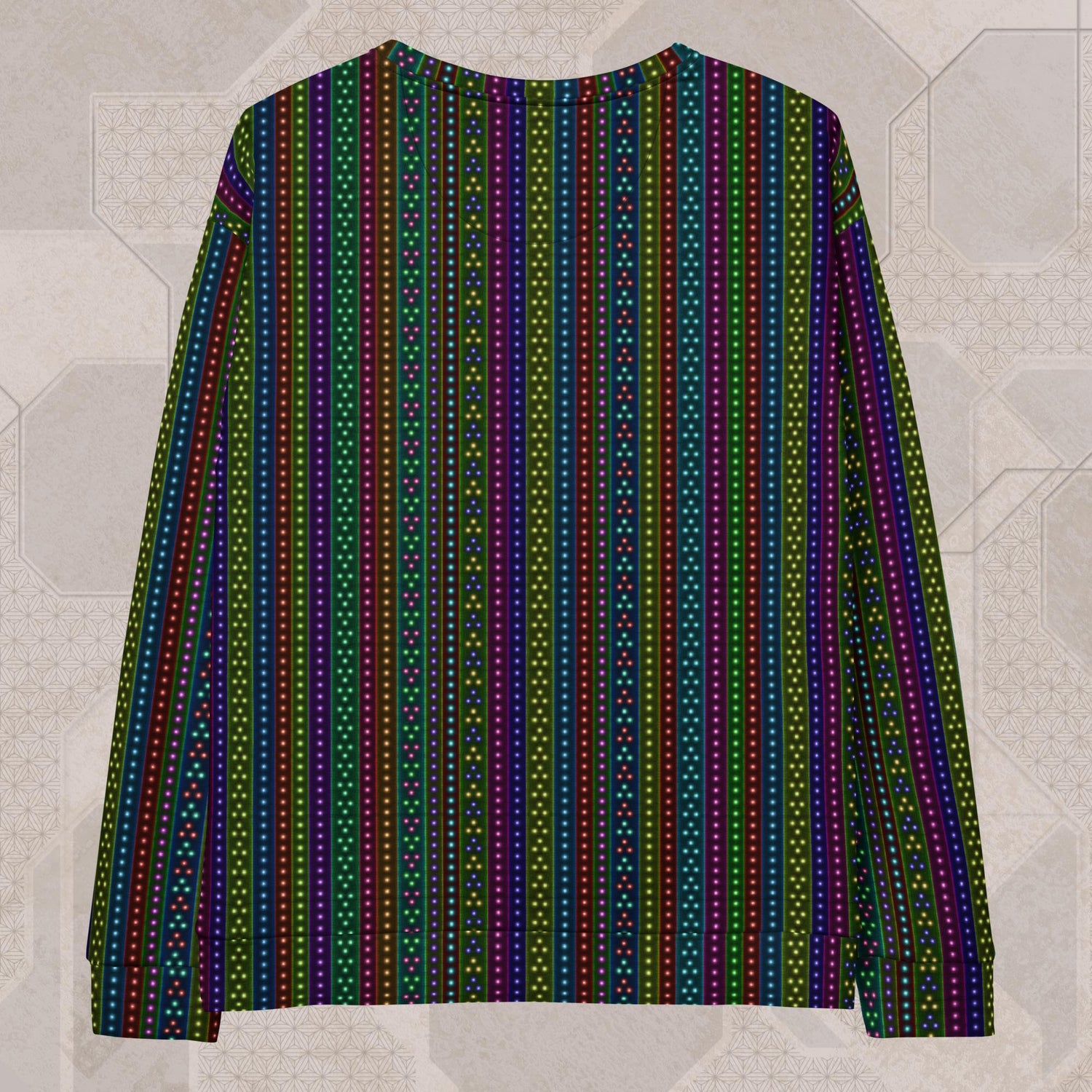 The vibrant, fade-resistant print reacts under both RGB and UV light, making it ideal for festivals, chill nights, or everyday wear. Made in the USA from recycled plastic bottles and finished with durable triple-stitching, this is your go-to layer for comfort, color, and conscious design.