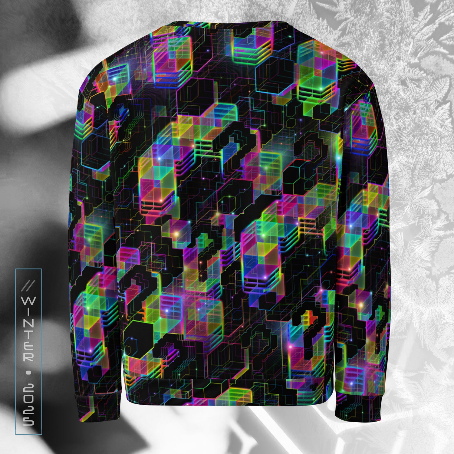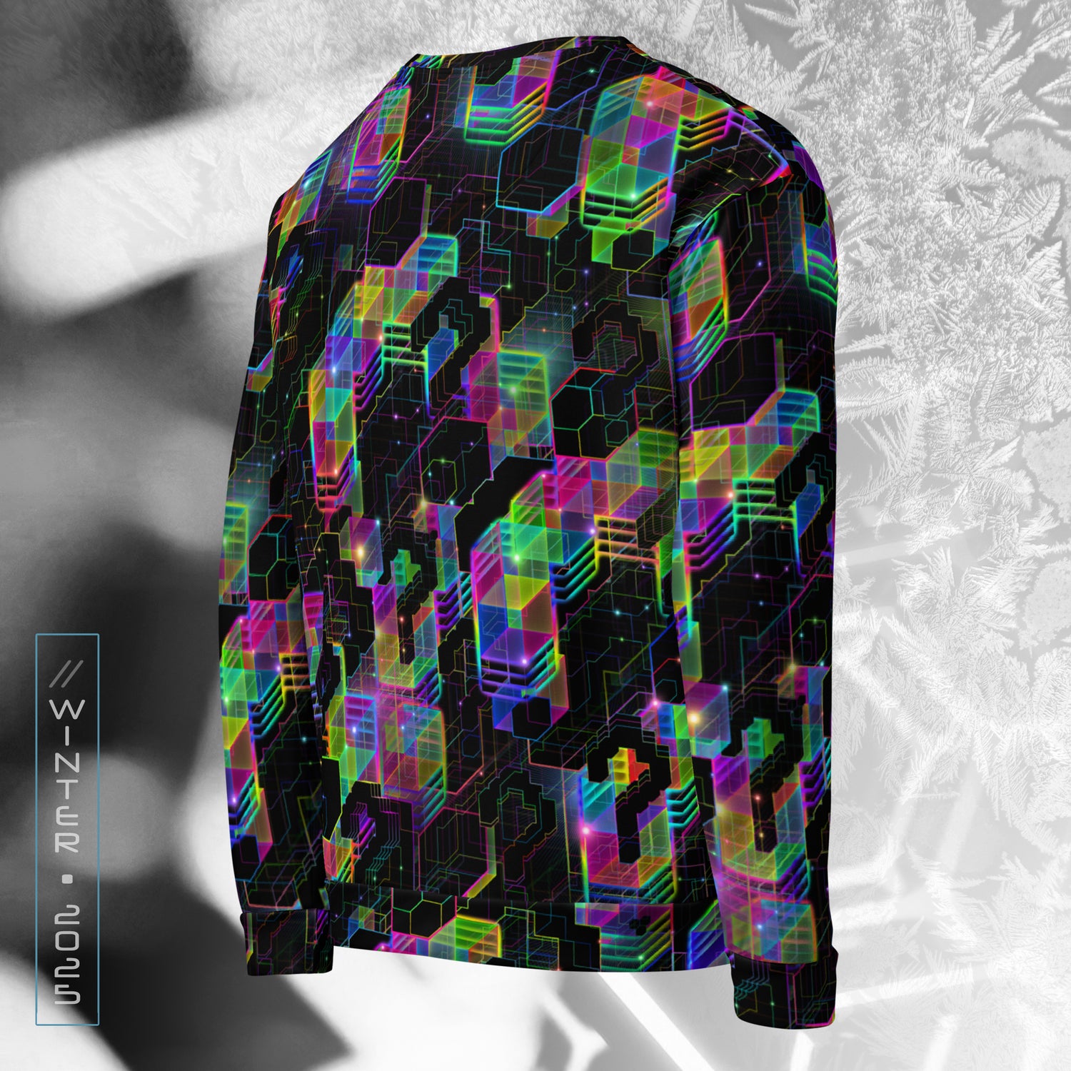 The vibrant, fade-resistant print reacts under both RGB and UV light, making it ideal for festivals, chill nights, or everyday wear. Made in the USA from recycled plastic bottles and finished with durable triple-stitching, this is your go-to layer for comfort, color, and conscious design.