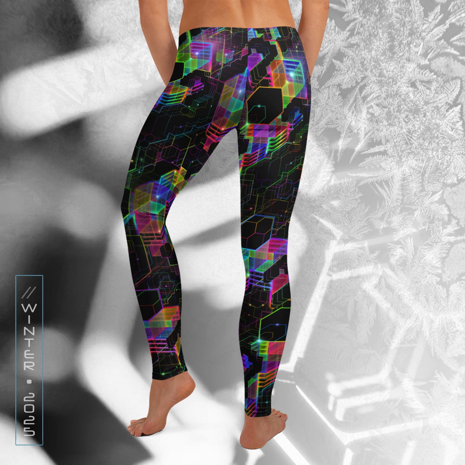The UV-reactive, fade-resistant print glows under blacklight and stays vibrant over time. Designed with an elastic waistband and triple-stitched seams for lasting durability, they also feature UPF 50+ sun protection. Sustainably made from recycled plastic bottles, these leggings deliver high-performance comfort with bold visual impact.