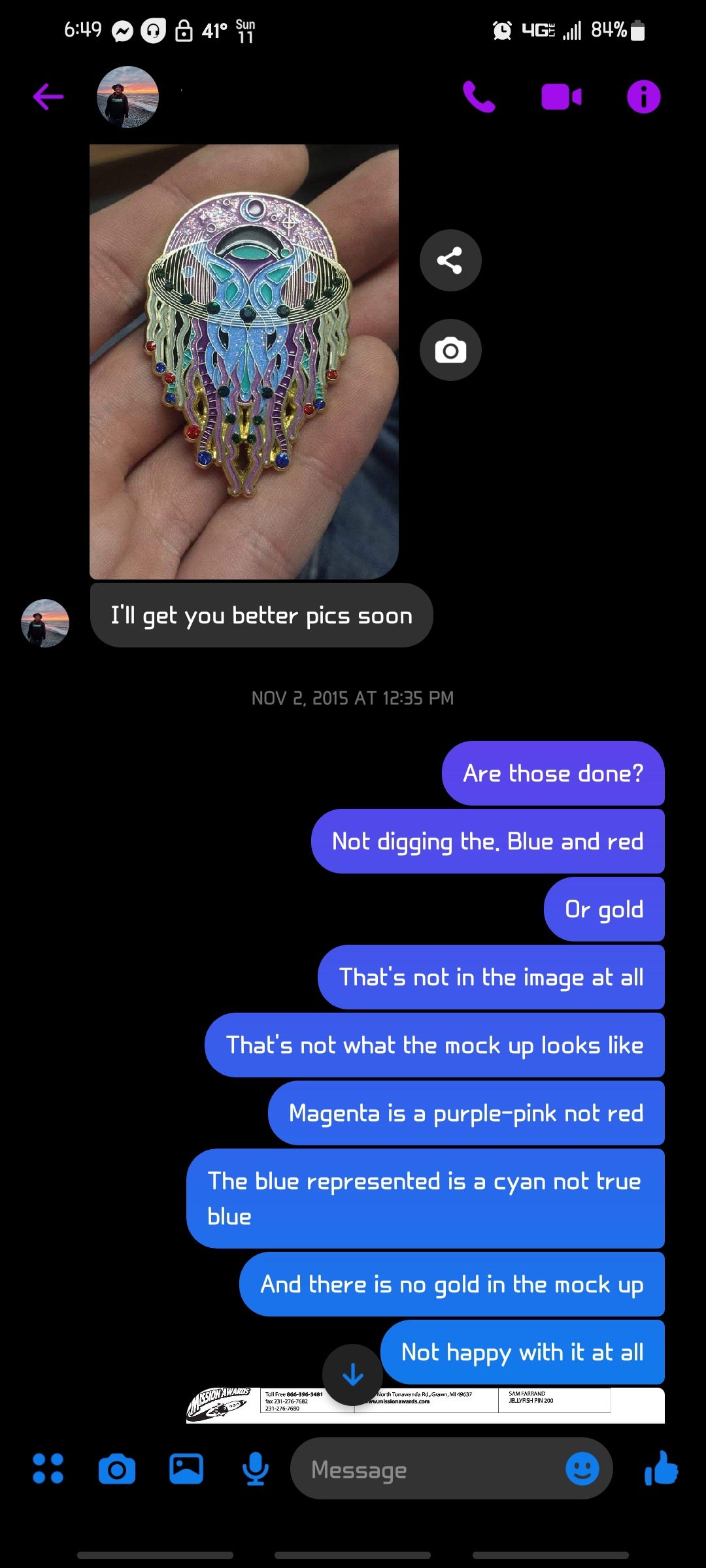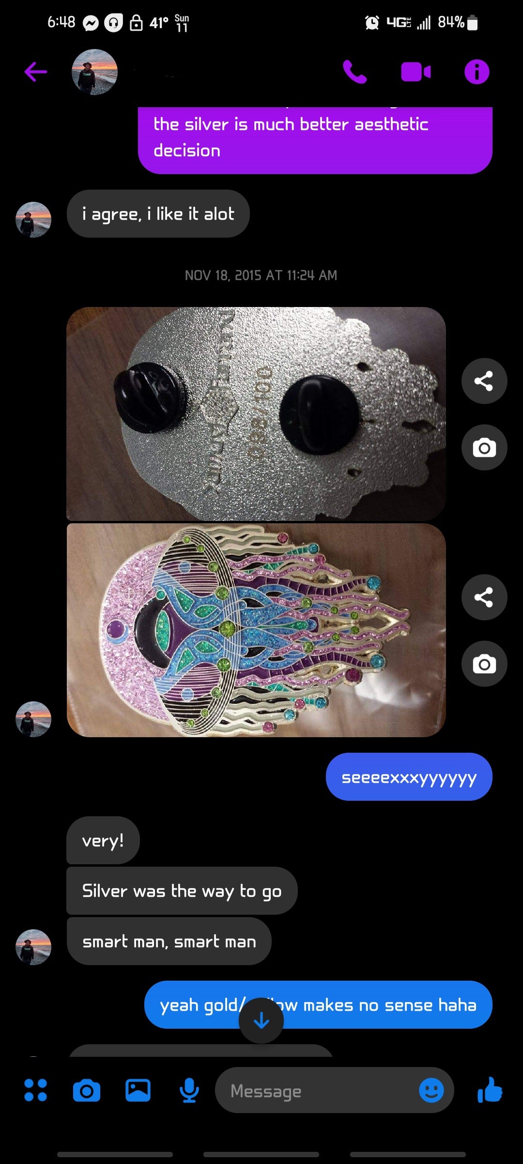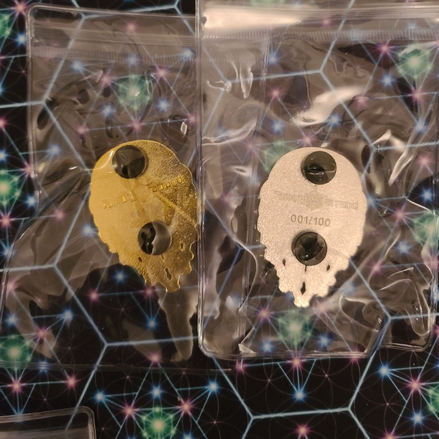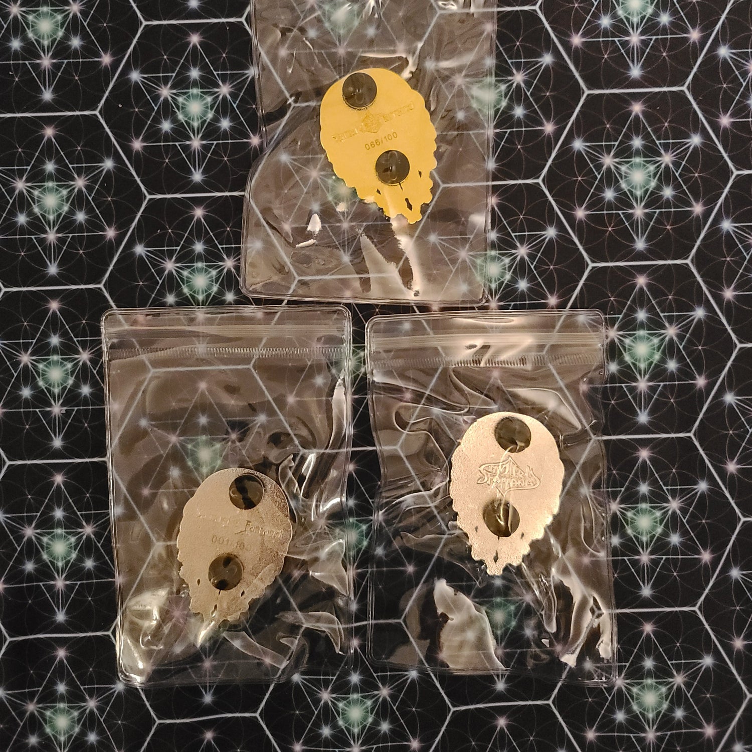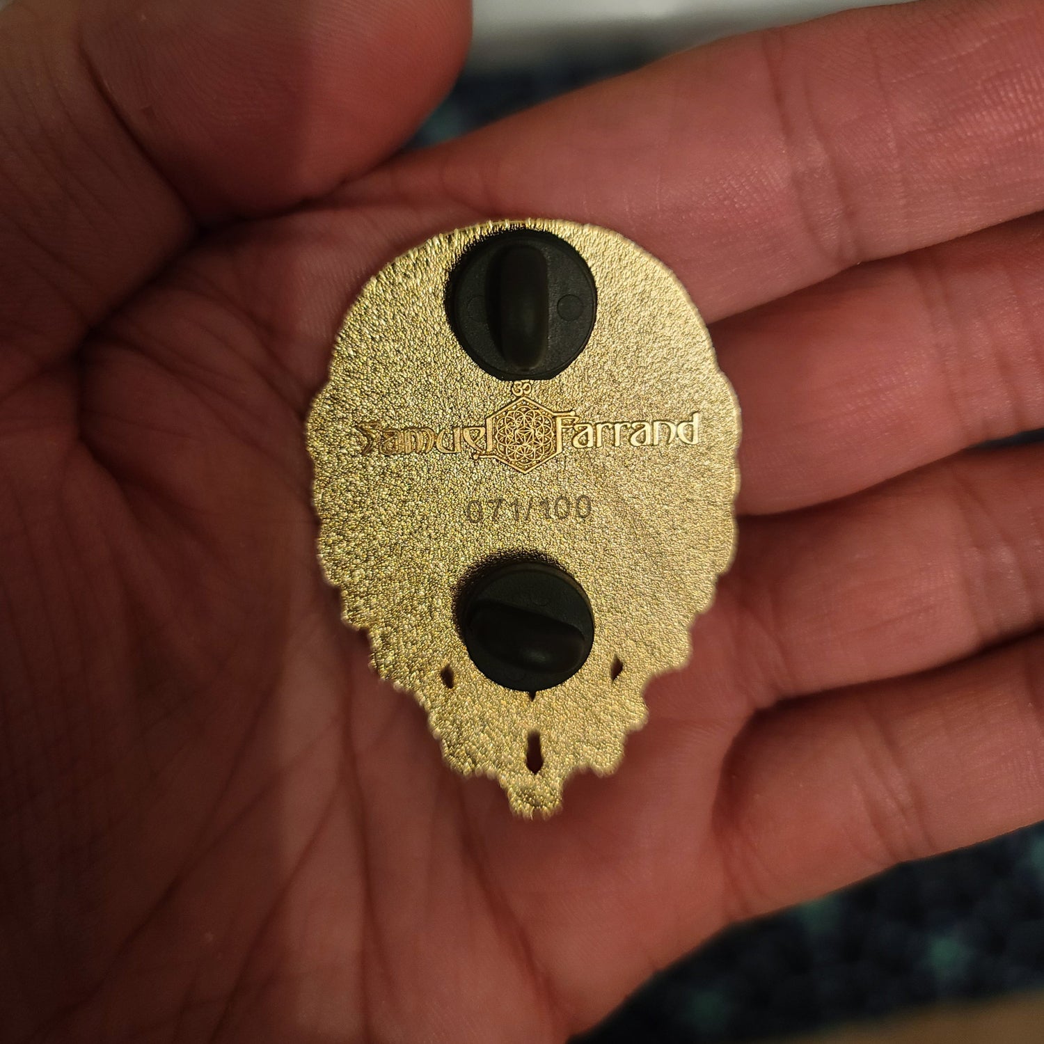 This is the very first Prototype of the infamous Samuel Farrand Psychezoa Luminosum Pin originally released in 2015. While producing the first version the factory messed up and used a wrong champagne metal body and used dark colored rhinestones. The original release had more lighter tone rhinestones and a silver backing that was numbered. Production on the champagne backs was stopped immediately and only 13 incorrect pins were fully produced and were added to the original order. Sam selectively gave out 9 to his closest friends at the time. 1 is tucked away into his private collection and for the first time in 7 years he is making 1 opened one available and 2 sealed prototypes available. The original 2015 Jellyfish pin release sold out in days and at the time was revolutionary as no pin was ever attempted by adding rhinestone, glitter enamel and uv enamel combined. Upon its release it shatteerd the pin world as Samuel Farrand raised the bar several notches in production. The Jellyfish is one of the most coveted pins in the pin world only a few lucky people still have an original release from 2015. This is not only a collectors item but an offer to own a piece of Samuel Farrands artistic legacy. Each Pin measures 2".